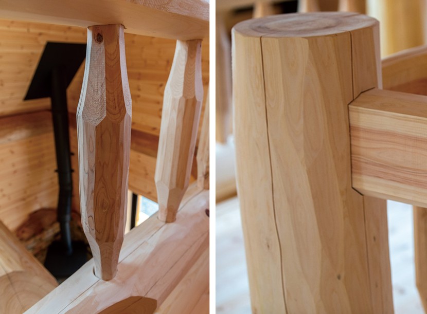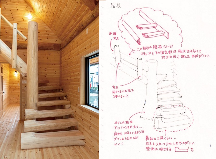 「丸太の魅力を楽しめる家にしたかったので、階段に使うシンボル的な柱は木が生えているようなデザインにしました。家のあちこちで丸太の断面が見えるようにしたのもこだわりです。細かい要望が伝わるように、私の考えを妻がイラストにしました」とご主人。 キハタトレーディングからの提案も参考にした。「C様には施工例をお見せして、造作や間取りの参考にしてもらいました。気に入った事例を自分たち好みにアレンジされたのが、とても素敵でしたね。洗面脱衣室への間口に飾ったアーチ状の木は、自社の山へ案内して一緒に探したものです」と、設計担当者は当時を振り返る。