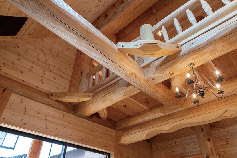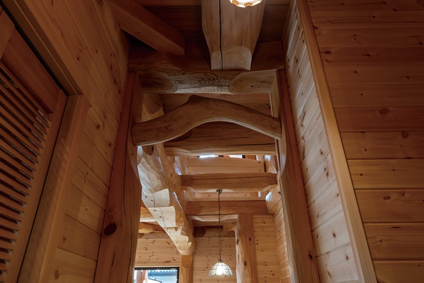 土地が市街の住宅地にあるため、ハンドカットの雰囲気と同時に、周囲と調和する外観や、間取り・デザインの自由度の高さも重視。ポスト& ビームを選択した。太い丸太が織りなす構成美や、手仕事ならではの持ち味が生きるデザインプランを希望。外壁は漆喰、室内の壁はパイン材の板張り仕上げとした。シンプルな空間に丸太が映えている。