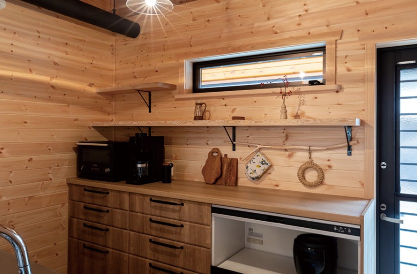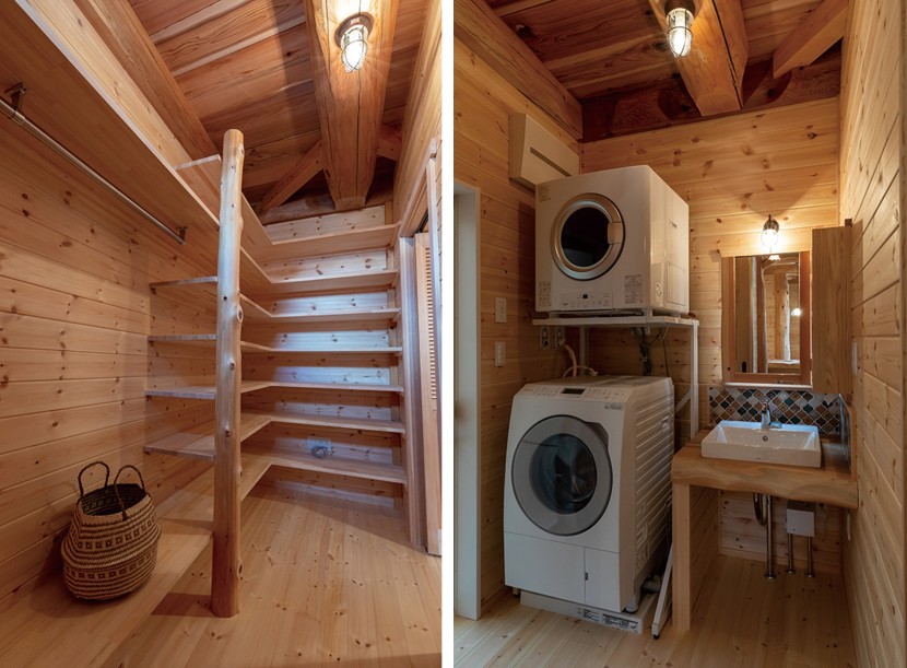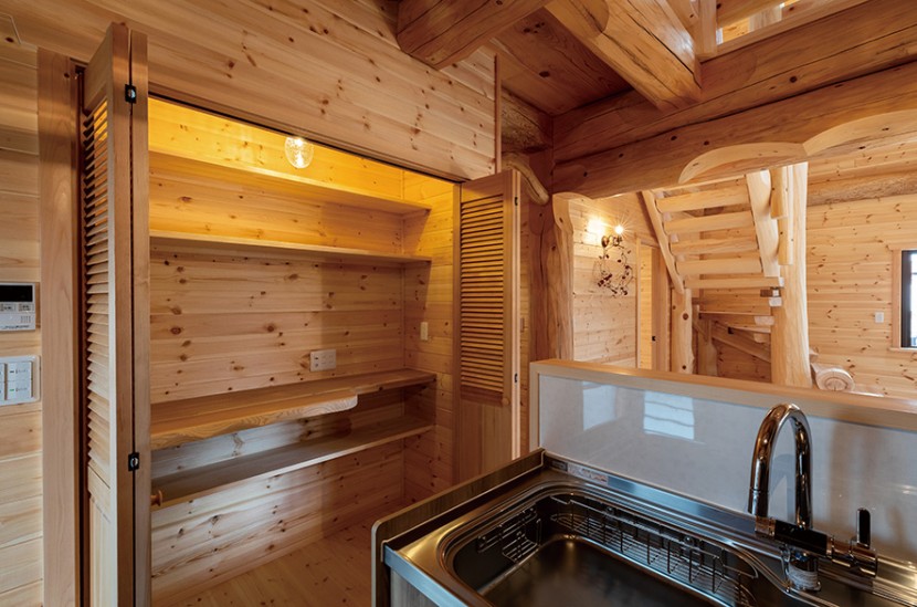 吹き抜けにかけたキャットウォークや、屋根裏のような個室など、空間のおもしろさが満載のC さん邸。一方、居住性や使い勝手にもこだわった。キッチンや洗面脱衣室などの水まわりを集中させて家事効率をアップ。収納棚も希望通りのサイズで造作し、十分な容量を確保している。「薪ストーブやオープンロフトなど、家族でどう使って遊ぼうかとても楽しみです」と、念願の木の家を手に入れた喜びを噛み締めている。
