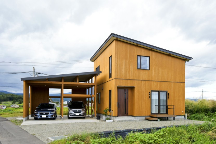 福島県本宮市の美しい田園風景の中に静かに佇むY邸。この家は、無垢の角材を縦方向に並べたパネルで壁を作る「タテログ」という構法により建てられた、まったく新しいスタイルのログハウスだ。 ログハウスといえば丸太や角材を横に積んで壁にするのが普通だが、「タテログ」はログを縦に並べてビスで緊結し木の壁(パネル)を作り、それを組み合わせて建物を造るという構法である。国産の無垢材を専用の加工機械により組み合わせたパネルは、寸法の狂いが1mm以下という精密さを誇り、「タテログ」により建てられた家は断熱性能にも優れている。 国産材を使用するパネルの緊結に、シックハウス症候群の原因となる揮発性の接着剤は不使用。また、防耐火性能試験や耐力壁性能試験により、火災や地震に対する強さも実証されている。無垢の木ならではのぬくもりが存分に感じられながら、住宅としての性能にも優れる「タテログ」は、まさにこれからの時代にふさわしい木の家といえるだろう。