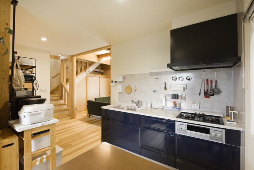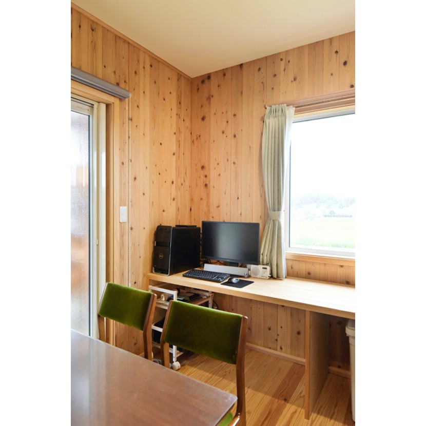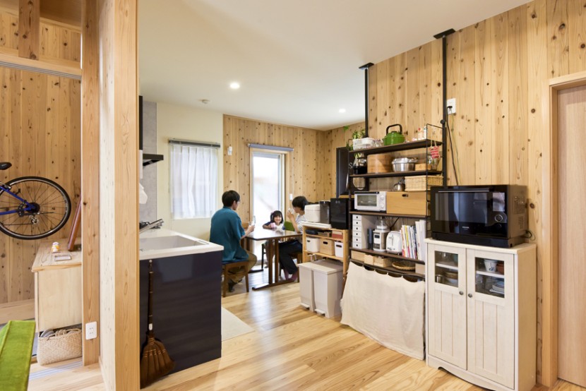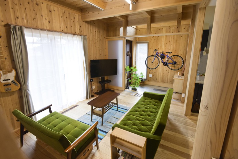 国産のスギの角材をパネルにして壁を作る「タテログ構法(ビスタイプ)」による木の家。北東側と北西側の壁は在来工法を用いており、室内の壁も無垢の木あらわしのみではなく、部分により高断熱のガイナ塗り仕上げにしている。
