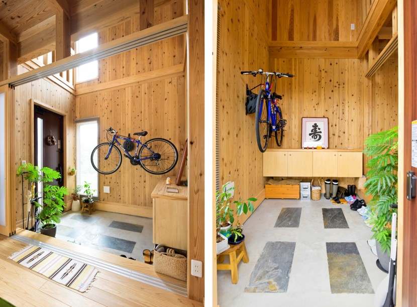 モルタルと天然石を組み合わせた玄関土間。靴箱の下に空間が設けてあり、長靴や道具類を置いておくことができる