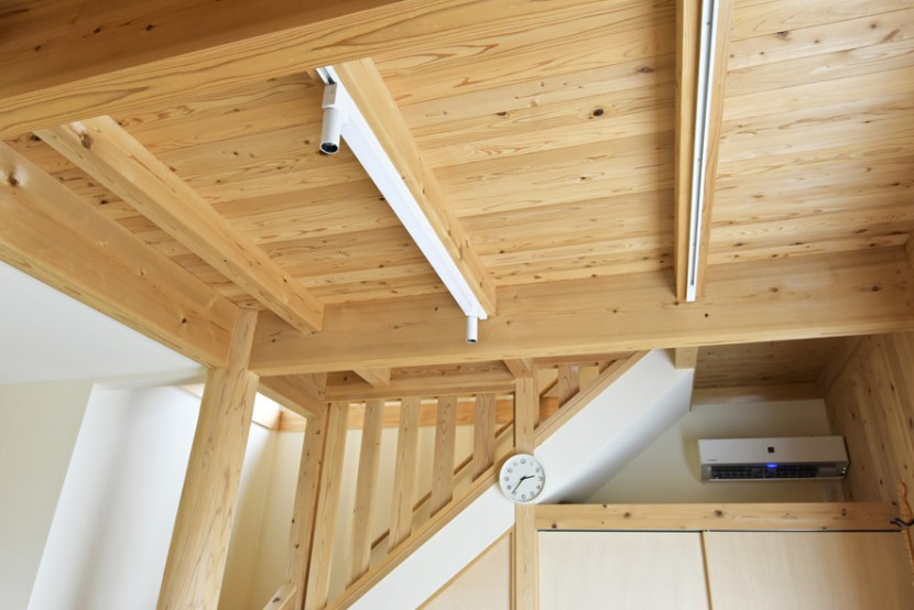 リビングの天井は無垢のスギ材。2階の床板に45mm厚のスギ板を使用しており、その裏側をそのまま見せている