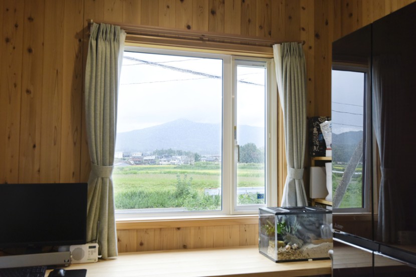家の北西側にある安達太良山の雄大な山容が見えるよう、大きな窓を設置。稲田越しに沈む美しい夕日も堪能できる