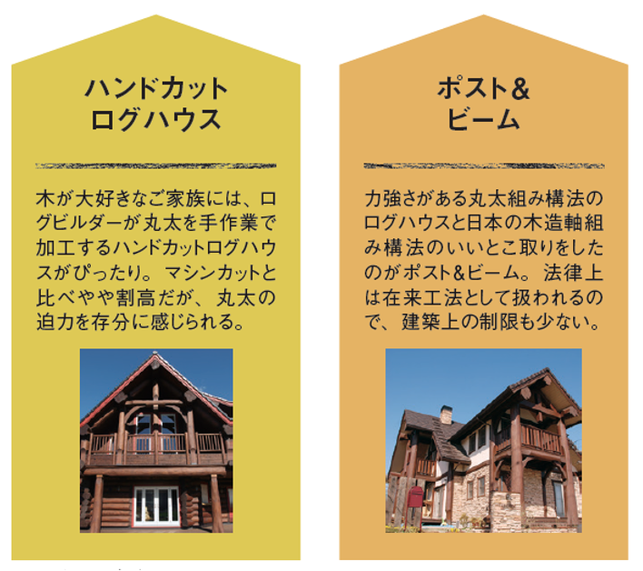 【これぞ丸太小屋。丸太の雰囲気を存分に味わえる】 作り手が意匠を凝らし、ほぼ原形のままの丸太をダイナミックに組み上げるハンドカットログハウスは、まさにオンリーワンの家。丸太の表情を感じたい人、個性を求める人にはこれ以上の住まいはない。