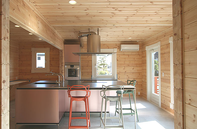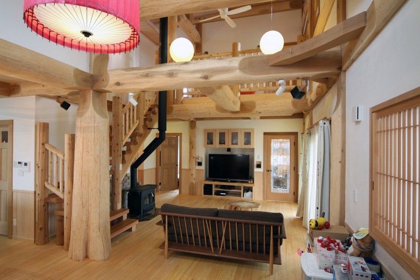 【大口径の丸太を匠の技で組む軸組み構法の家】 一般住宅と同じ在来工法として扱われるため、設計自由度が比較的高いのが魅力。木の存在感がありながら、一般住宅と変わらぬ居住性が得られる。壁材が選べるので、好みの雰囲気も出しやすい。