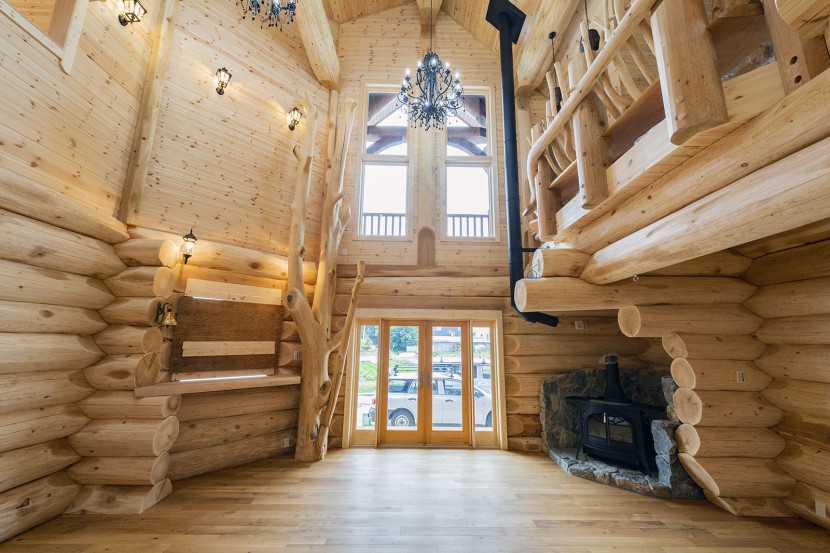 【外見はワイルドでも、室内の壁はフラット】 アルファベットのD の字型のログ材を使用。外壁はハンドカットログハウスのように凹凸があるが、室内側は平らなので、家具類が置きやすい。機械で加工したログ材は均一性が高く、精度が高い。