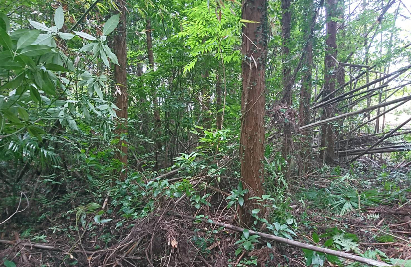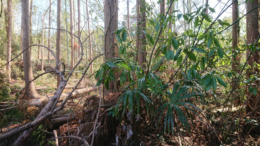 我々が木を伐り出す所は、放置されている杉林なので、ジャングルの様に立ち入れないほど植物が生えてしまっています。この状態だと動物の住みかになり獣害の元になります。これを整備しながら木を伐り出します。
