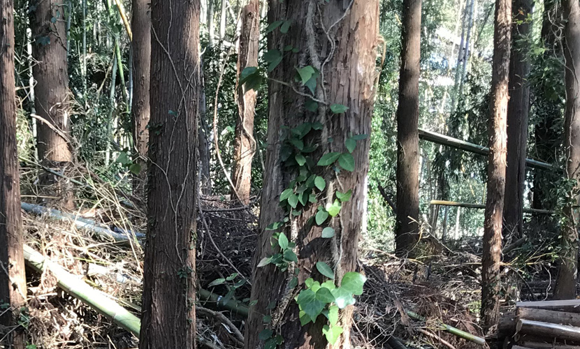 また、伐倒方向に影響を及ぼす可能性がある、立木に伝っているツタなども排除しておきましょう。