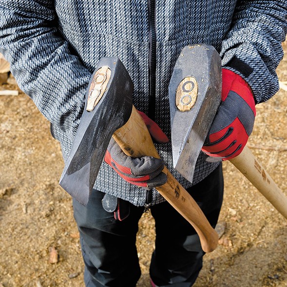 薪割り用のオノには、刃が厚いものと薄いものがある。厚いものはヘッドの重さで刃先を薪に食い込ませ割り裂くタイプで、力がある人はこちらのほうが楽に割れる。一方、薄いものは鋭い刃で切り裂くように薪を割るタイプ。非力な人はこちらのほうが使いやすいことがある。自分の体格や力と相談し、使ってしっくりくるものを選ぼう。