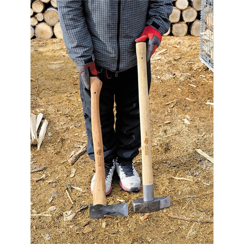 ドイツのクラフトマンシップが宿るブランド、バイソンの槌つきの薪割りオノ。ヘッドの後ろ側をハンマーとしてクサビを打ち込める。