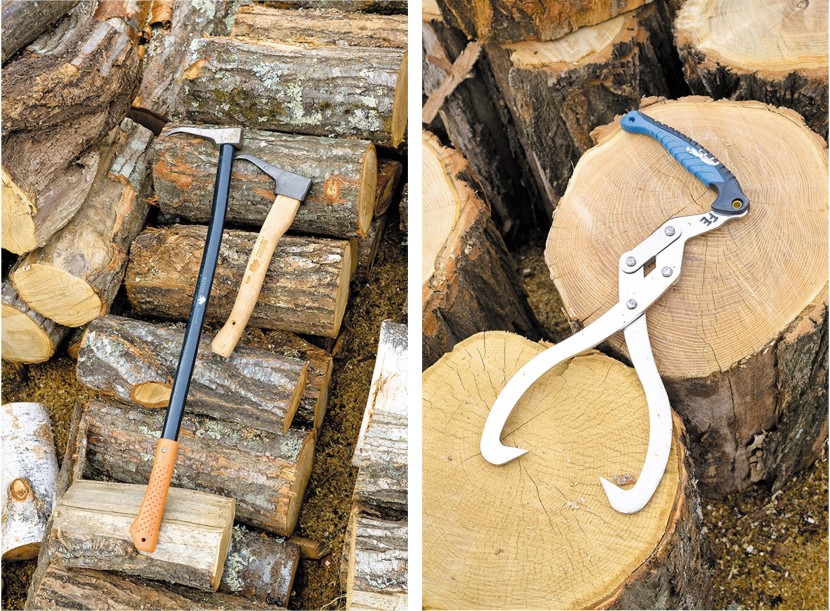 丸太を運ぶのに、手だけだと重く持ちにくい。爪で引っ掛けて運べるピックやリフティングトングがあると、圧倒的に作業が楽になる。