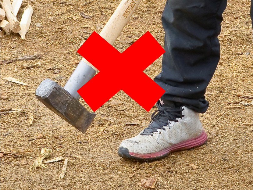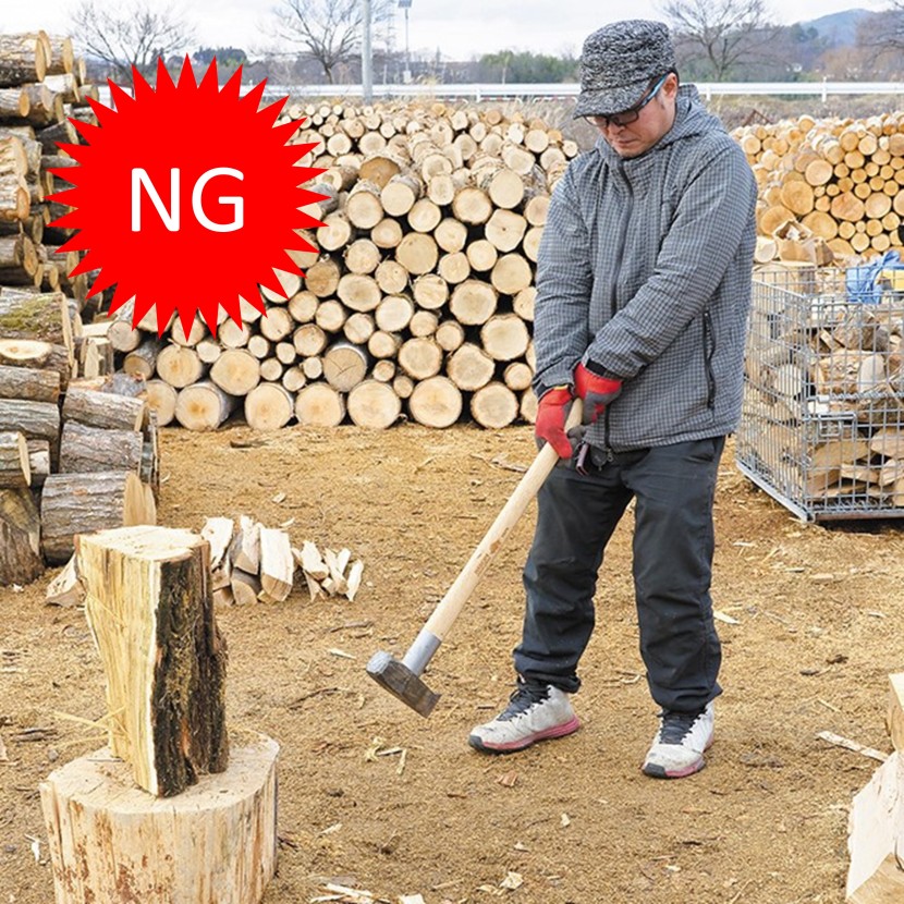 オノを振り下ろすときに腰を下に落とさないと、ヘッドが自分の足に向かって落ちてきてしまうので注意!