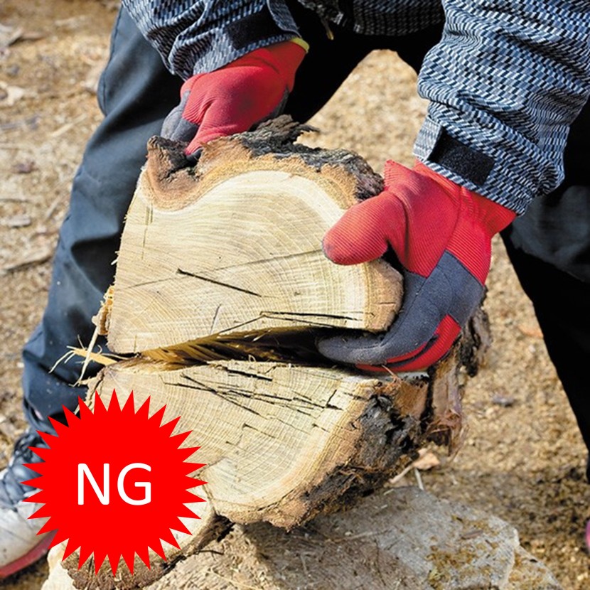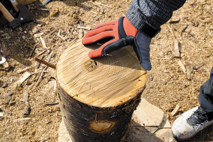 丸太の割れ目に指を入れて持ち上げるのは、置いたときなどに指が挟まれてしまうので危険。これで骨折することもある。