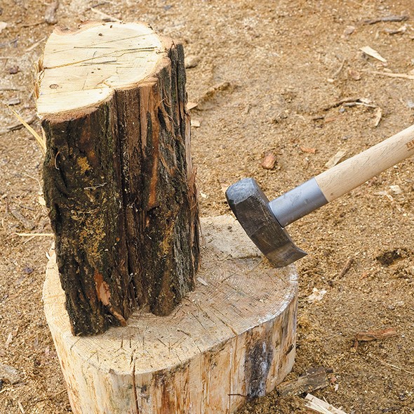 丸太を置くときに根元側を上にすると割れやすい。節がある部分や繊維がねじれた部分は割りにくいので、そういう部分は避けて割るといい。