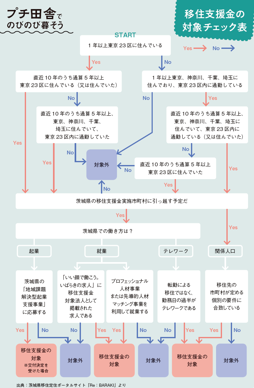 現在、茨城県では移住者を対象としたさまざまな支援金制度で移住をサポートしている。例えば、茨城県内に移住して県内で起業、または県内の企業に就職する人などに向けた「わくわく茨城生活実現事業」では、最大300万円の支援金を給付。これは、現在東京23区に在住・通勤している人を対象としており、支援金制度の対象かどうかは下図で簡単にチェックできる(細かい要件などについてはホームページで確認を)。