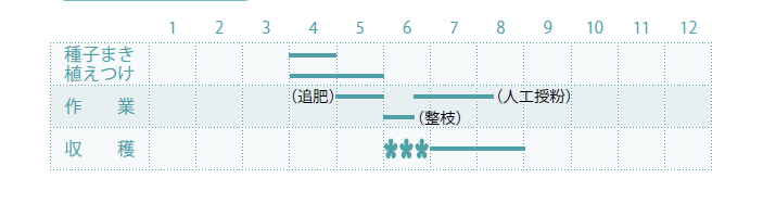 1. [種子まき] 土を入れた9cmポットに、湿らせた種子を横に寝かせるようにして1cmぐらいの深さに埋める。 2. [植えつけ] 本葉が5枚ぐらいになったら植えつける。 3. [追肥] 植えつけ2週間後と、実がやや大きくなってきた頃に、株のまわりに化成肥料を少量施す。 4. [整枝] 親ヅル1本、子ヅル1本の2本仕立てにし、ほかの子ヅルは摘む。2本のツルは離すように広げる。 5. [人工授粉] 花が咲いたら、雄花を摘んで雌花の中心にある雌しべに雄花の花粉をつける。 6. [病害虫対策] 梅雨があけて乾燥しはじめると、うどんこ病が出やすいので風通しをよくすること。 7. [収穫] 開花後40~45日ぐらいが適期。実のつけ根部分の茎(果柄)が、コルクのようになり、皮がかたくなってきたら、熟したサイン。