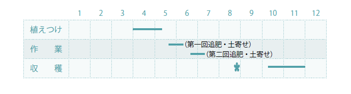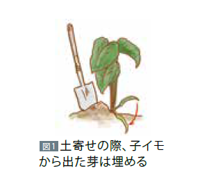 1. [植えつけ] よく耕した土に芽が出る方を上にし、タネイモを5~6cmの深さに植える。 2. [追肥] 梅雨入り前までに2回、少量の化成肥料を株のまわりに施す。 3. [土寄せ] 子イモは親イモの上にできる。地上に子イモが出ないようにするため、追肥と同時に、株元に土寄せをする。子イモから出た芽は土寄せの際に埋めてしまうこと。( 図1 ) 4. [病害虫対策] ヤマイモハムシが葉を食害するので見つけしだい捕殺。連作を避け、ネコブセンチュウを防ぐ。 5. [収穫] 霜が降りる前に、肥大したイモを掘り取り収穫する。あらかじめ地上部の茎葉を刈り取っておくとよい。