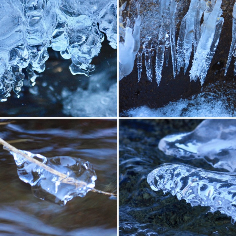 流れる水が凍った写真を集めてみました。 4枚の写真、実はすべて用水路を覗き込んだもの。 中央アルプスから流れる清流と寒さが作る様々な姿は、冬ならでは。 自然のアートですね。
