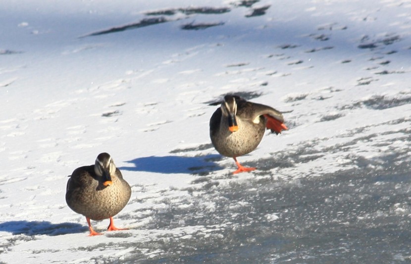 秋から春先まで、毎年たくさんやってくるカモくんたち。 で、時々カモ観察。 微動だにしないカモ、片足立ちしているカモ、 仲間にちょっかいを出している(?)カモ、 エサを探すカモ…。 そんな中、「おっとっと…」。カモも滑るんですね(笑)。