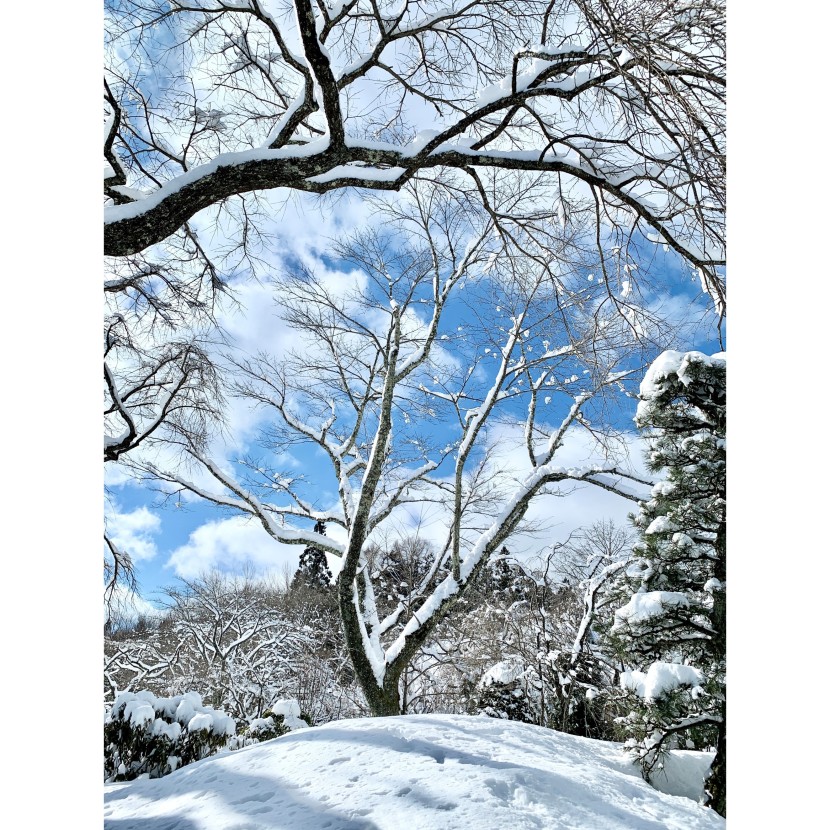 雪の翌朝、近くの神社に行ってみました。 春が近いこの時期の雪は少し重たくて、枝に白い花が咲いたよう。 童話『花咲かじいさん』のセリフ「枯れ木に花を咲かせましょう…」を 思い出してしまいました(ちょっと違うけど… ^ ^)。
