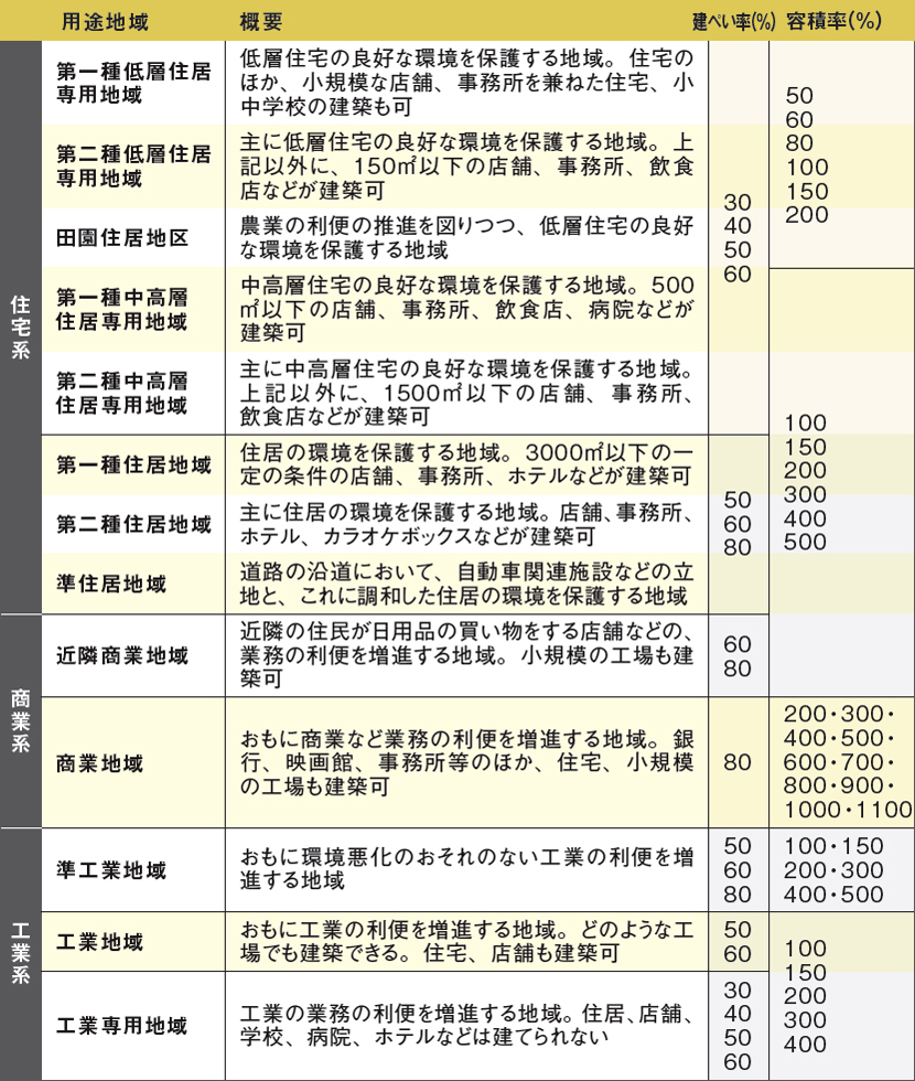 まずは土地について。現在、土地は「都市計画法」により住居系、商業系、工業系合わせて計13の地域に区分されている。このうちログハウスが建てられないのは工業専用地域のみ。この地域には、ログハウスだけでなくほかの住居も建築することはできない。
