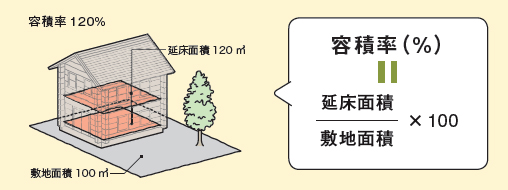 容積率は、敷地面積を100とした場合に、建てることのできる延床面積の割合。住居専用地域で50~500%となっている。