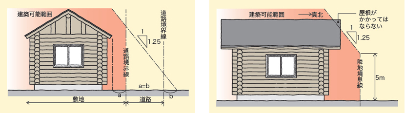 「道路斜線制限」は、前面道路の幅により、建物の各部分の高さを制限されるもの。住居系用途地域の場合、原則前面道路の反対側の境界線から1対1・25の勾配の斜線内が建築可能範囲となり、適用距離(20~35m)まで適用される。また、住居専用地域内で定められている「北側斜線制限」は、北側の敷地境界線上5mもしくは10mの高さから1対1・25の角度で引かれる斜線内が建築可能範囲となる。