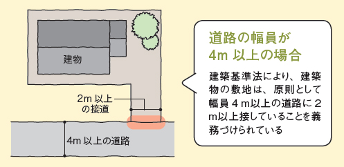 建築基準法では、都市計画区域内の建物の敷地は、道路に2m以上接していなければならないとされている。これを接道義務という。