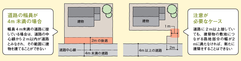 ここでいう道路とは、幅4m以上の道路のことであり、それ以下の場合は基本的には道路とみなされない。ただし、古くから住宅が立ち並んでいたような地域では4m未満ということも多く、その場合は、道路の中心線から水平距離2m以内が「みなし道路」となり、敷地内でも建物を建てることはできない。