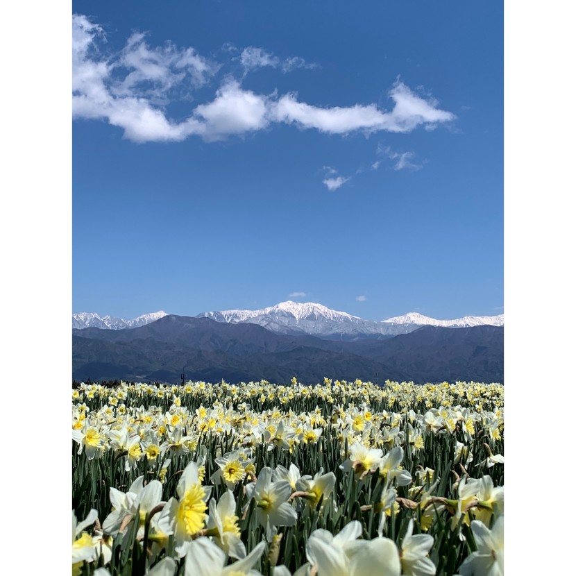 あと2~3週間もすると スイセンの花々が一面に広がります。 数種類の品種が植えられているので、 次々と咲き変わり、1ヶ月程度楽しめます。 南アルプスの残雪とのコラボが、信州らしいですね。