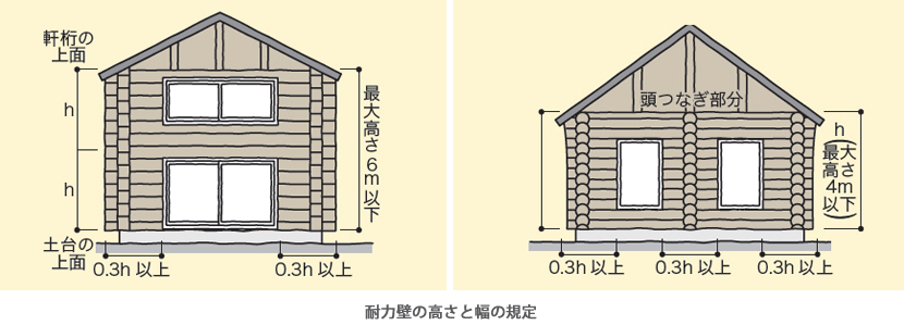 「丸太組構法技術基準」においては、1階建ての場合はログ壁の高さは4mまで、2階建ての場合は6mまでとなり、壁の幅は高さ×0・3以上あれば耐力壁とみなされる。つまり、開口を作れるのは、それ以外の部分になるということである。