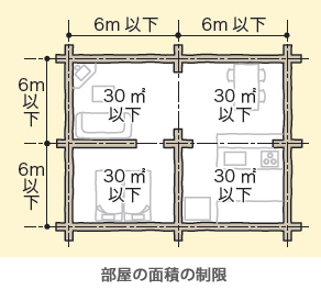 「丸太組構法技術基準」では、ログハウスの延床面積は300㎡まで、屋根の高さは8.5mまで、ひと部屋の広さは30㎡以下とされている。こうした基準は、構造上安全なログハウスを建てるためのものなので、しっかりと認識しておく必要があるだろう。