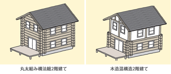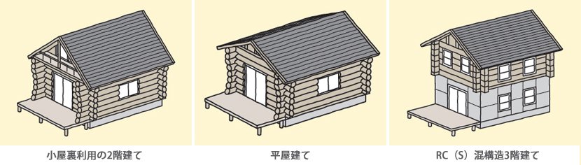 ログハウスに関する法律である「丸太組構法技術基準」によって規定された、建て方や階数のバリエーションは5つある。