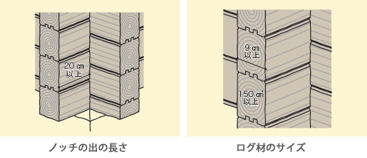 家の強度を確保するために、ログ壁の厚さや施工法についての規定も設けられている。