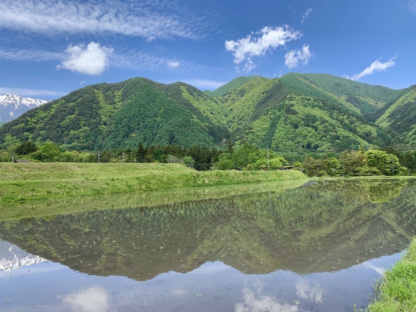 風のない穏やかなお昼時、水田にはリフレクション! 新緑の濃淡が、モコモコの絨毯のように見えませんか。 遠くではカッコウが鳴き始め、 初夏らしくなってきました。