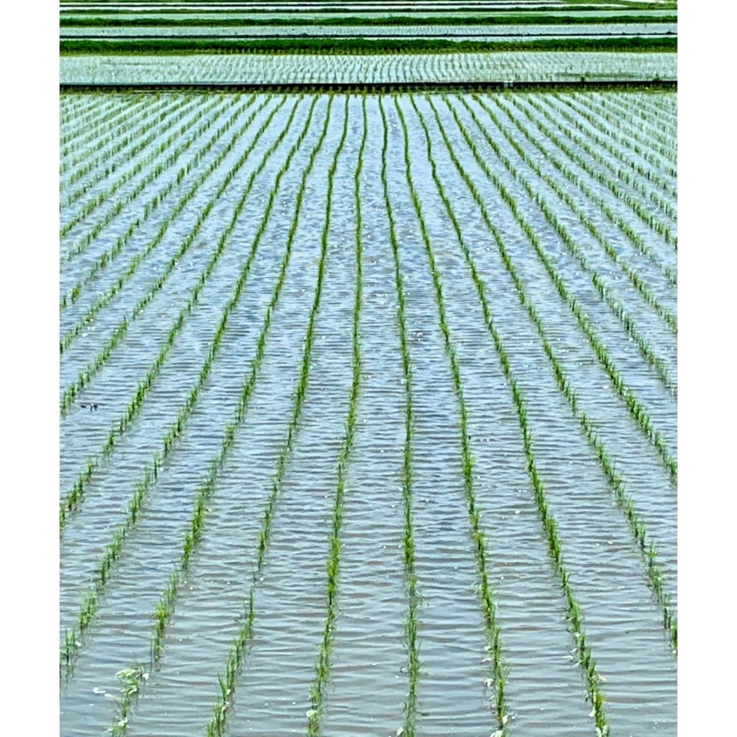 お行儀よく整列した苗。 この風景の脇を車で通ると、 ストライプの柄が次々流れていくようで、不思議な感覚になります。 昔は1本1本、人の手で植えていたと思うと頭が下がります。