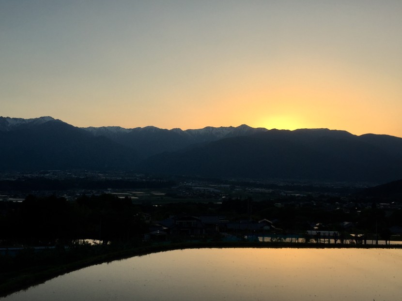 中央アルプスに日が沈み 水田に夕焼け空が写り込む景色は、この時期ならでは。 BGMは、もちろんケロケロケロケロ。 風景は少し寂しげですが、実は賑やかです。