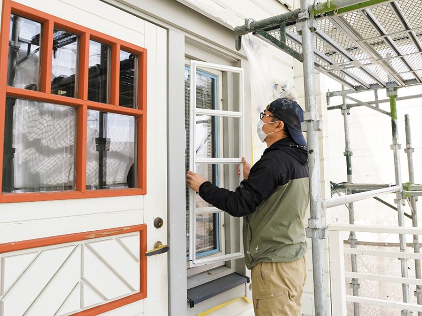 足場を組んで高圧洗浄をしたら、すぐにでも塗りたいと思うのが人情ですが、その前にマスキングテープやマスカーで必ず養生をしておきましょう。特に基礎や窓は念入りに行うと仕上がりが違ってきます。いったん塗料がついてしまうと、落とすのは大変なので注意を。35坪程度のログハウスの養生には、足場がある状態でおおよそ丸一日はかかると思ってください。