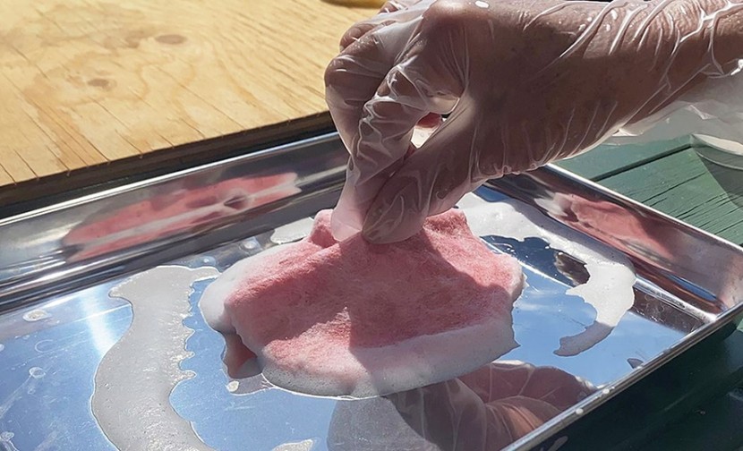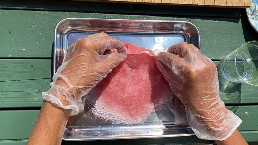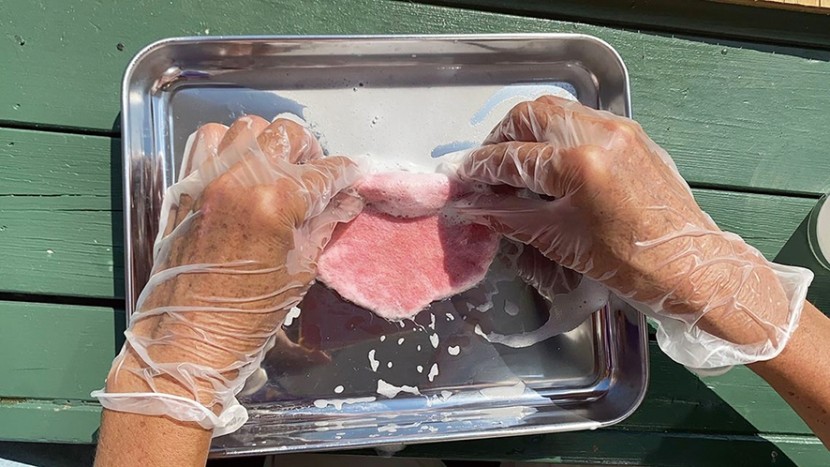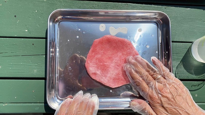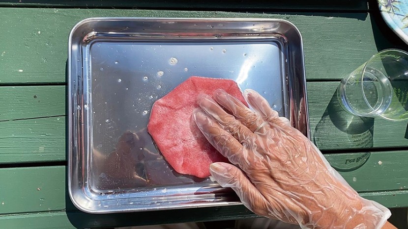 【工程①】 羊毛を細かくほぐして薄く重ね、少量の洗剤を垂らした湯に浸し、端の薄い部分を内側に折り曲げる