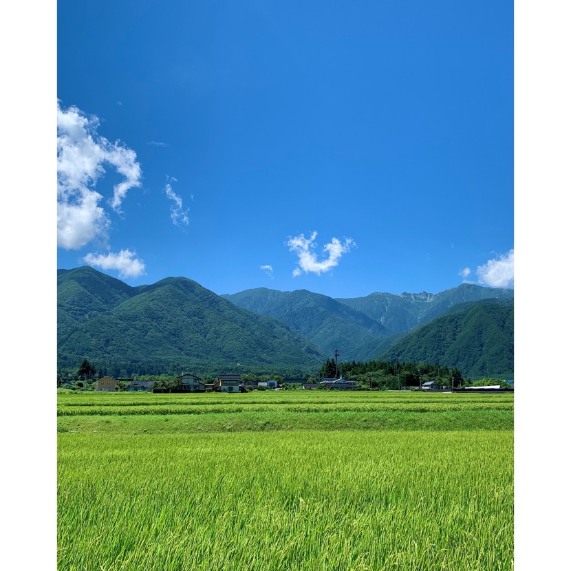 カラッとした久しぶりの快晴。 山頂がくっきり見えるような青空は 3週間ぶりくらいかもしれません。 稲穂の生育が心配でしたが、この日はたっぷり陽を浴びていました。 もうすぐ秋ですね。