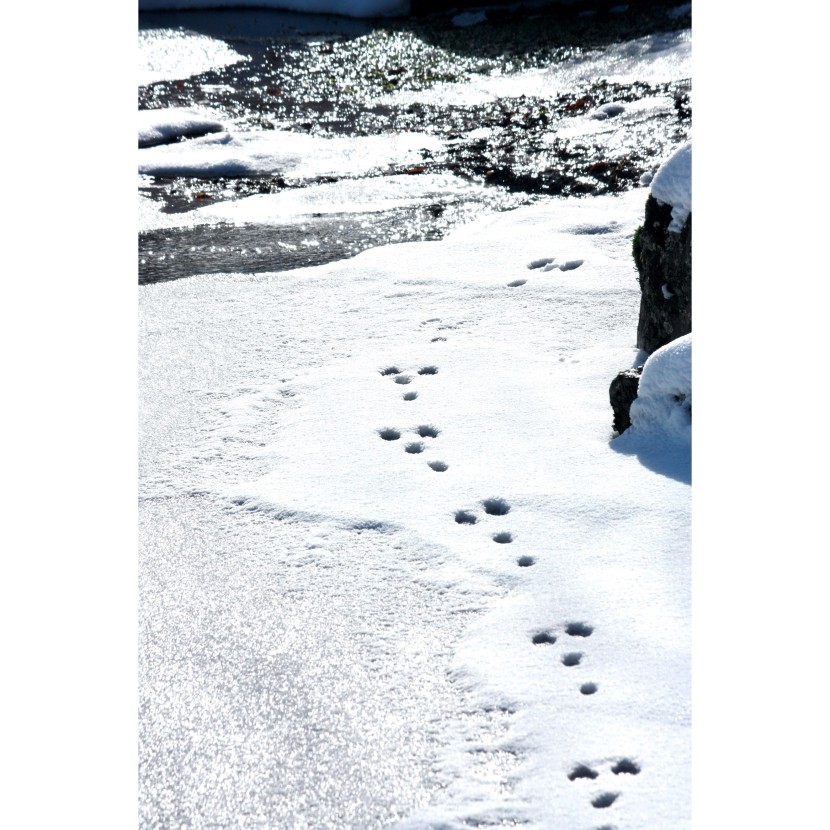 お寺の一角にある小さな池。 氷が解け始めてキラキラきれい! とカメラを向けると、 小動物の足跡がありました。 調べてみると、ウサギによく似ているのですが この辺りで野ウサギに出会ったことがありません。 2023年の干支にちなんで、出て来てくれたのかもしれませんね。