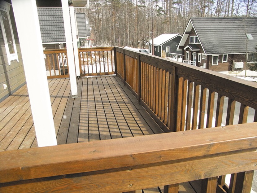 ②【ウッドデッキ】 広いウッドデッキには犬が飛び越えられない高さの柵を設置。2カ所の出入口にはドッグゲートも設置してある