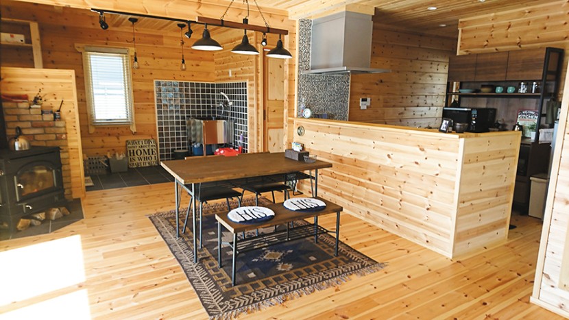 オーナーと愛犬が快適に暮らすためのログハウス。広い場所を走りまわるのが好きな犬のために開放的な間取りにしている。床の段差をなくす、玄関の一角をタイル張りの土間にしてドッグバスを設置するといった工夫も凝らして快適性をアップ。ウッドデッキに柵を設けてドッグラン化しているのもユニークだ。