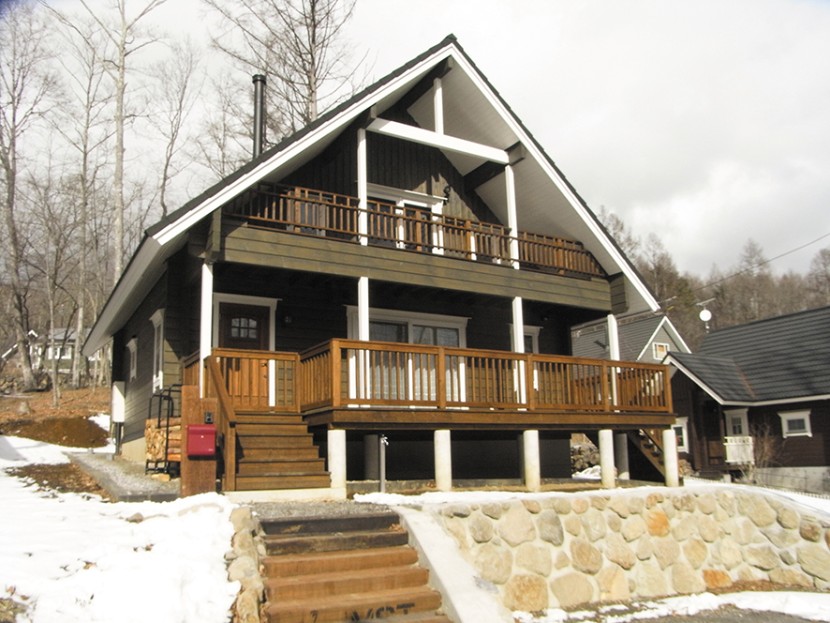 【外観】 ダークな色合いの外壁にアクセントカラーの白が映える外観。大屋根の深い軒の出がログ壁を風雨から守り、耐久性を高める