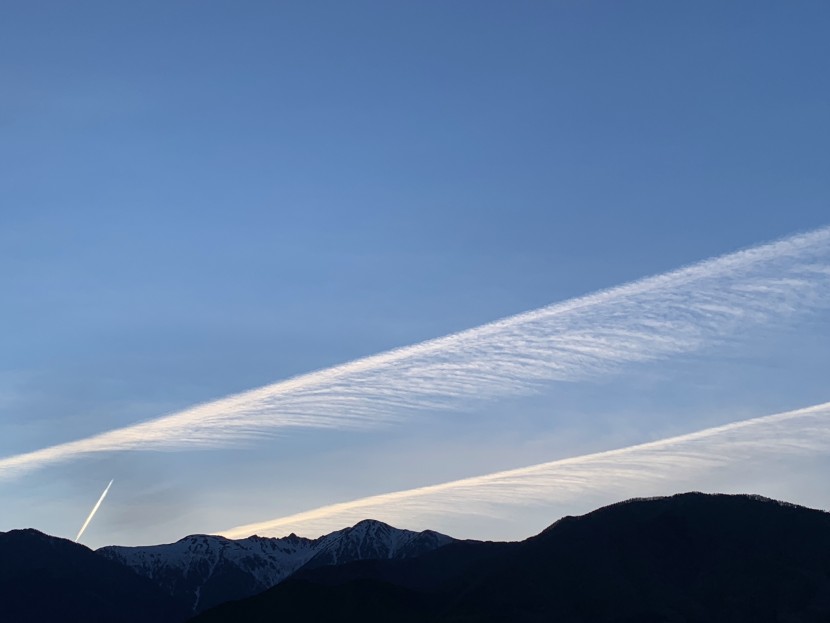 鳥の羽根のような不思議な雲に出会いました。 飛行機雲が風に流された? と思いましたが 気象関係の本を見たところ、 羽根雲(はねぐも)、ジェット雲(じぇっとぐも)に 少し似ているような…。 いずれも「巻雲(けんうん)」という種類の仲間らしく 高度10km以上の上層雲なのだそうです。