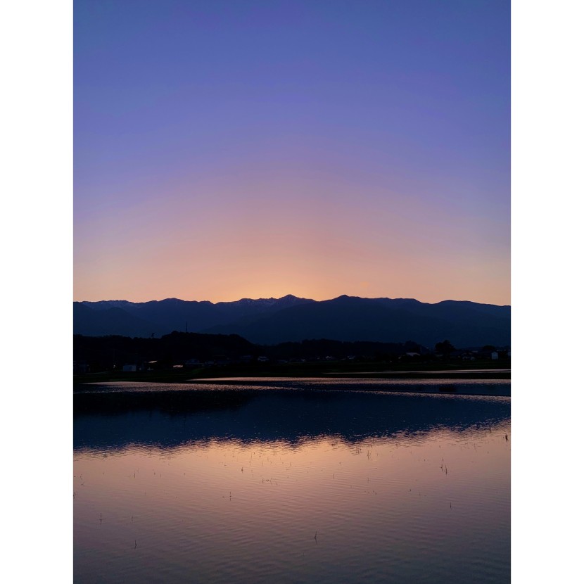 夕暮れ空がきれいになってきたので、 帰宅途中に少し遠回りをして 撮影スポットへ行ってみました。 遠くに見える稜線は、中央アルプスの山々。 オレンジからブルーへのグラデーションを ギリギリ見ることができました。