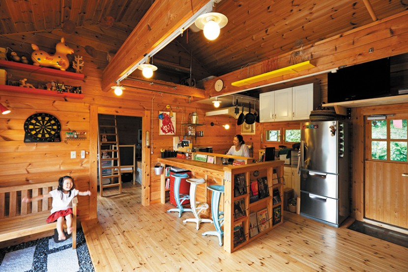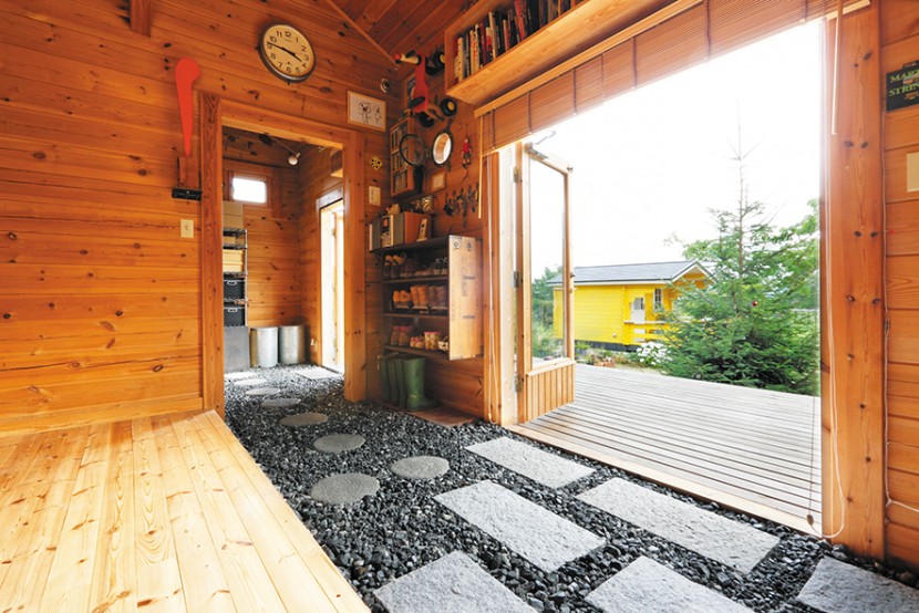 ご主人が彫刻家、奥さまが陶芸家というアーティストのご夫妻がセルフビルドした平屋ログハウス。玄関から続く長い土間は、ガラス質の砕石を敷き詰めたベースに飛石を配てある。遊び心あふれるデザインだ。