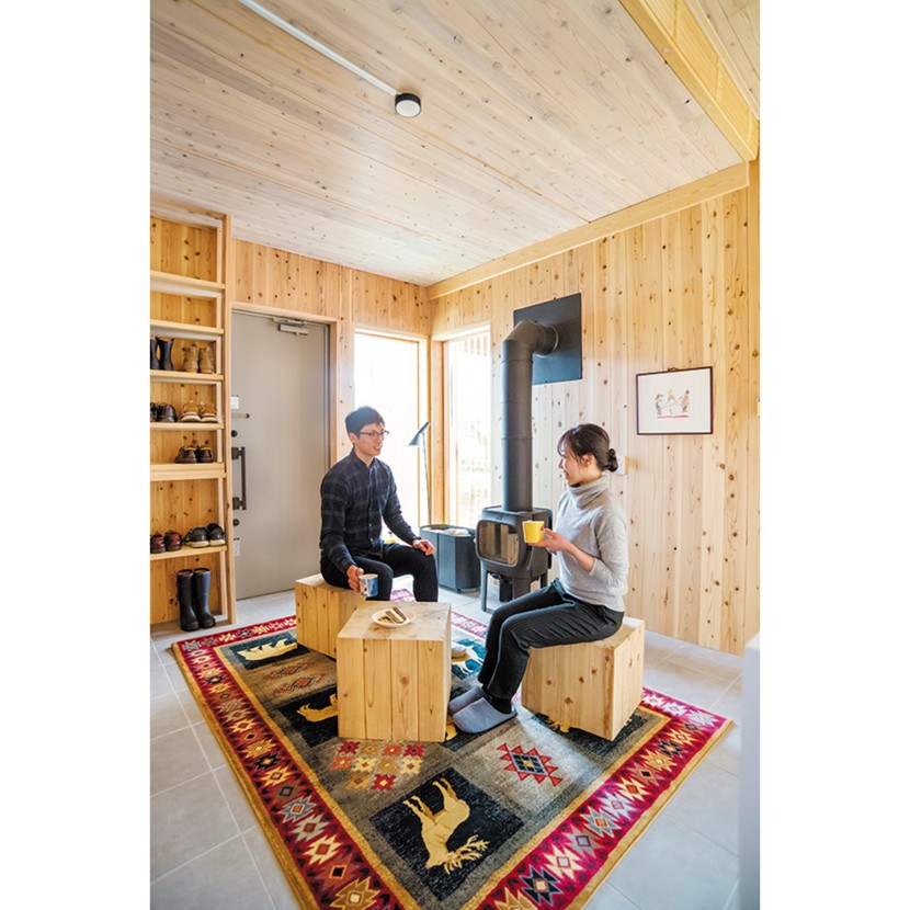 キッチンまで続く玄関土間は、ちょっとした来客の応対にもってこい。冬場は薪ストーブのぬくもりが最高のおもてなしに。リビングは一段上がる形なので、パブリックスペースとプライベートスペースが自然にゾーニングされている。