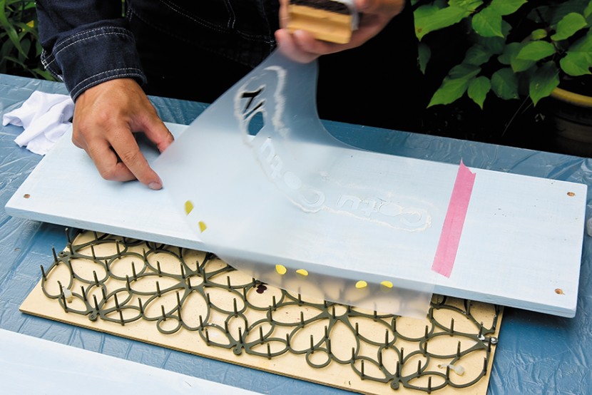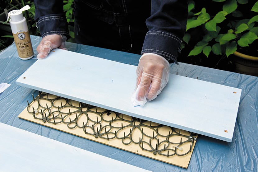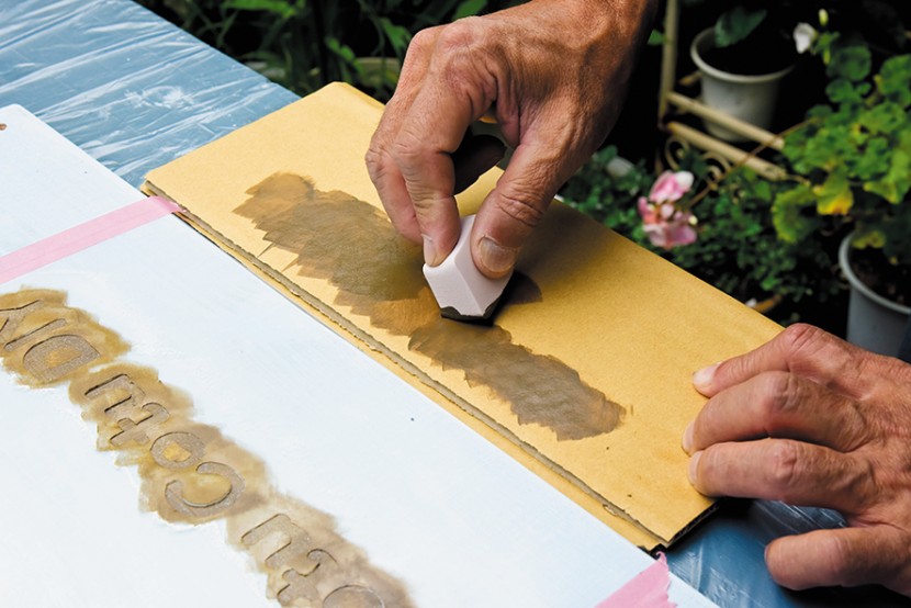ステンシルを施す部分は、塗料の弾きが出るためあらかじめサンドペーパーでこすっておく。マスキングテープを使い、板にステンシルの型を固定